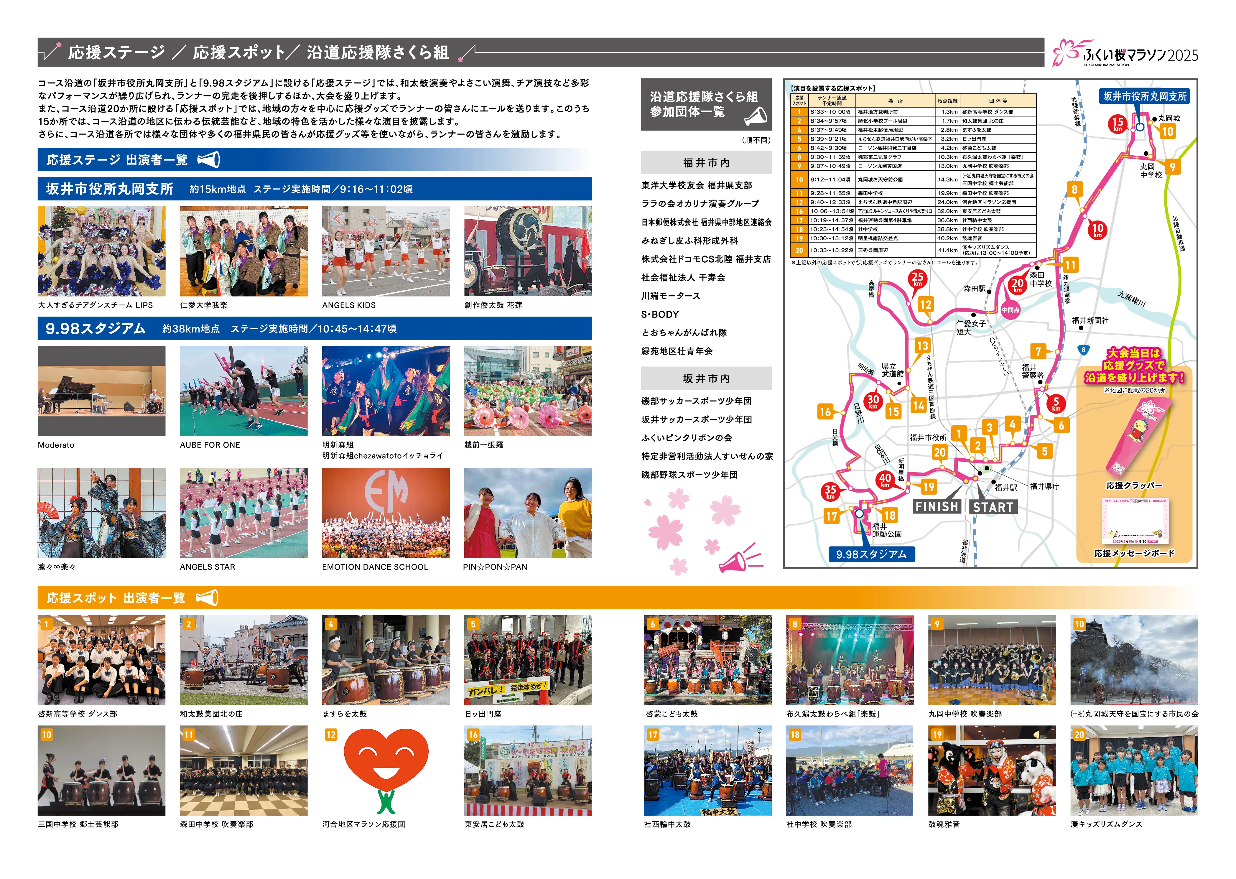 コース沿道の「坂井市役所丸岡支所」と「9.98スタジアム」に設ける「応援ステージ」では、和太鼓演奏やよさこい演舞、チア演技など多彩なパフォーマンスが繰り広げられ、ランナーの完走を後押しするほか、大会を盛り上げます。