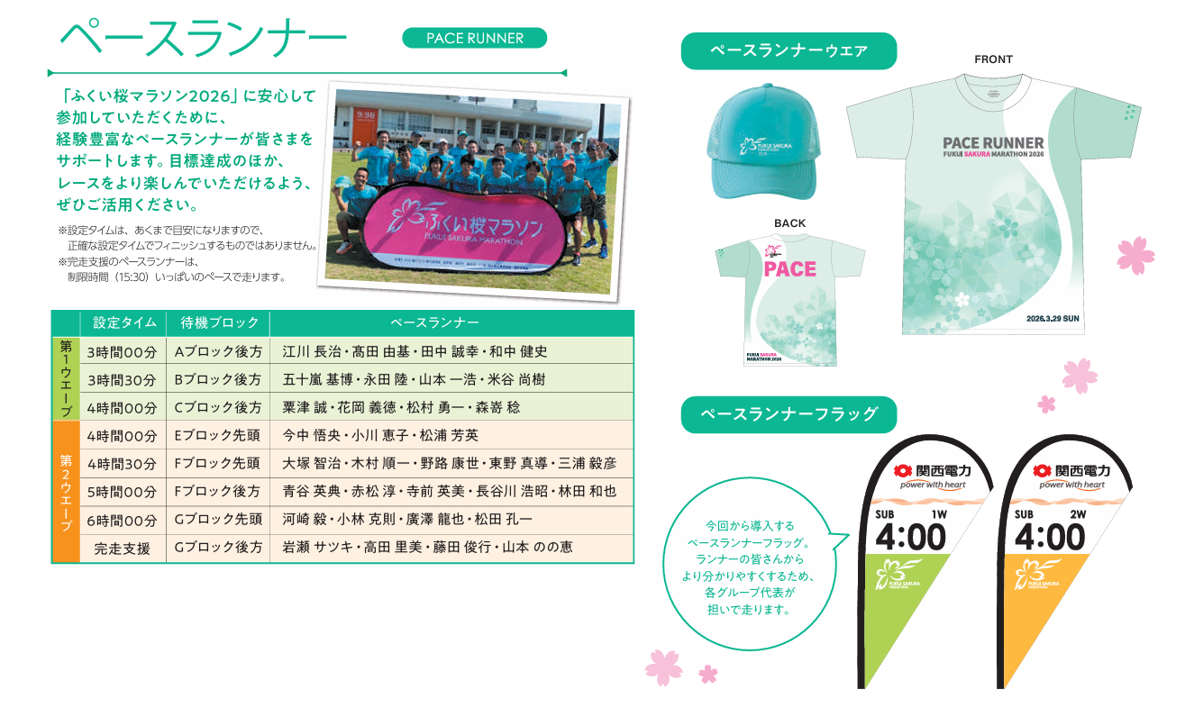 「ふくい桜マラソン2026」当日、サブ3~完走支援までのグループに分かれ、先導や声掛け等でランナーの皆さまの目標達成をサポートするペースランナーをご紹介します。